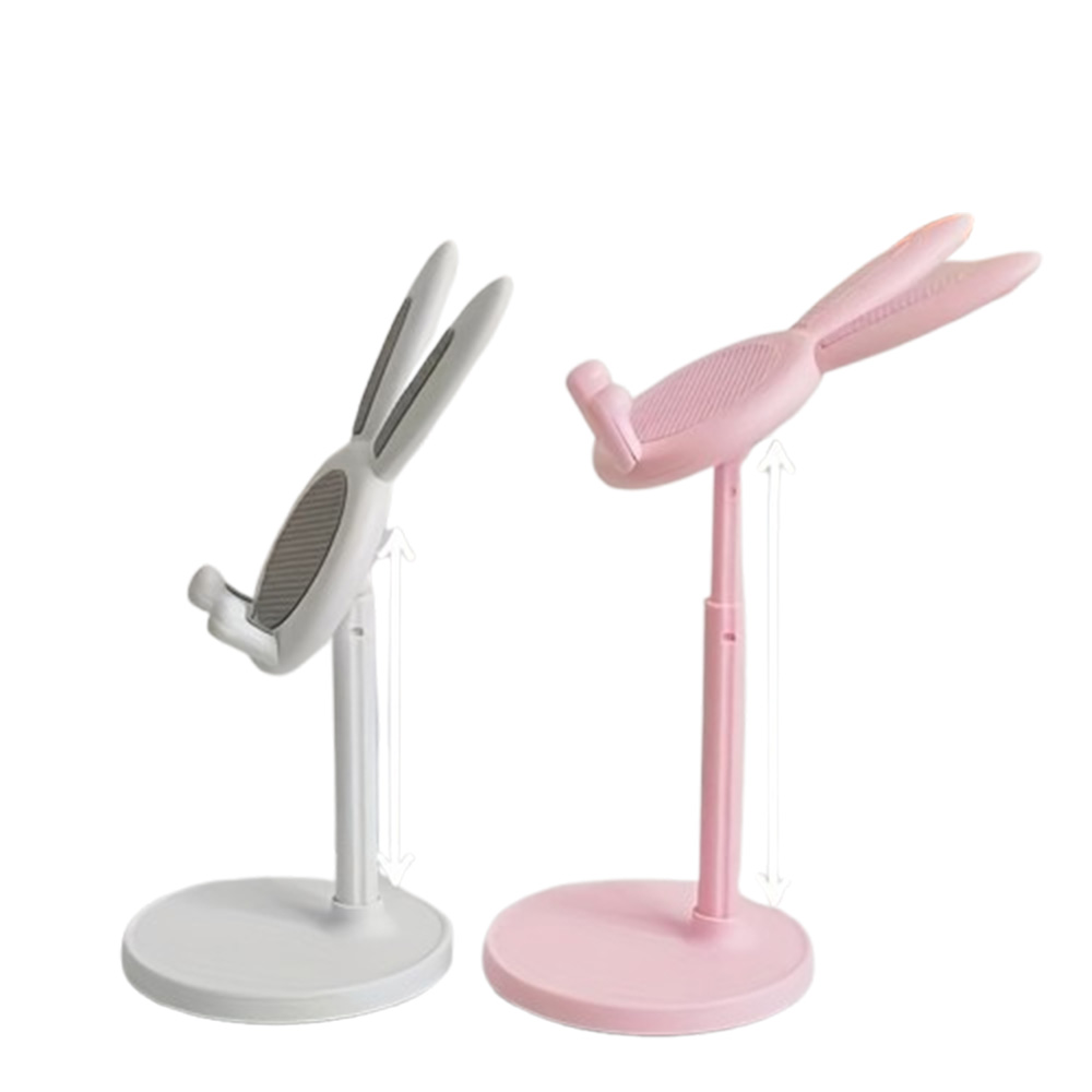 Adorable rabbit-shaped mobile phone stand with adjustable and retractable height, suitable for phones and tablets.